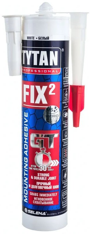 Монтажный клей TYTAN PROFESSIONAL Fix2 GT гибридный с мгновенным начальным схватыванием, 290 мл 73891 - это клей на основе гибридных полимеров с мгновенным начальным схватыванием и ускоренным временем отверждения. Создает прочное соединение, можно нагружать шов уже через 30 минут, а полная прочность достигается через 3 часа. Служит для внутренних и наружных работ.